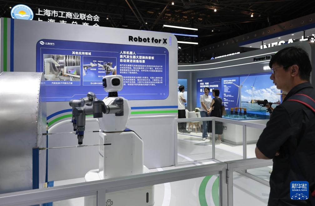 6月11日,参观者在一个进行作业演示的人形清洁机器人旁驻足观看。