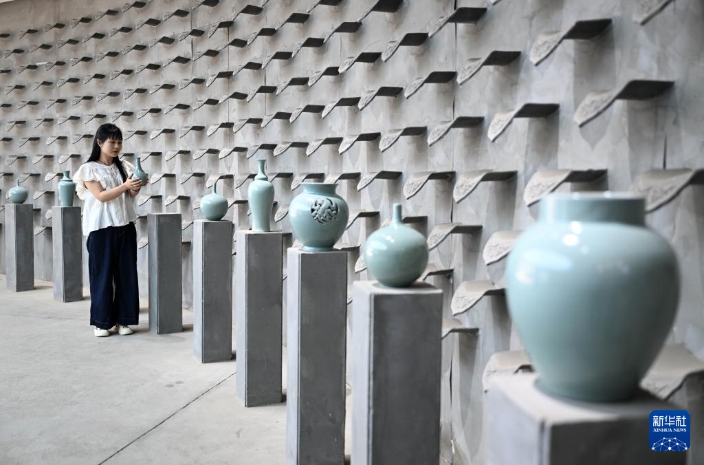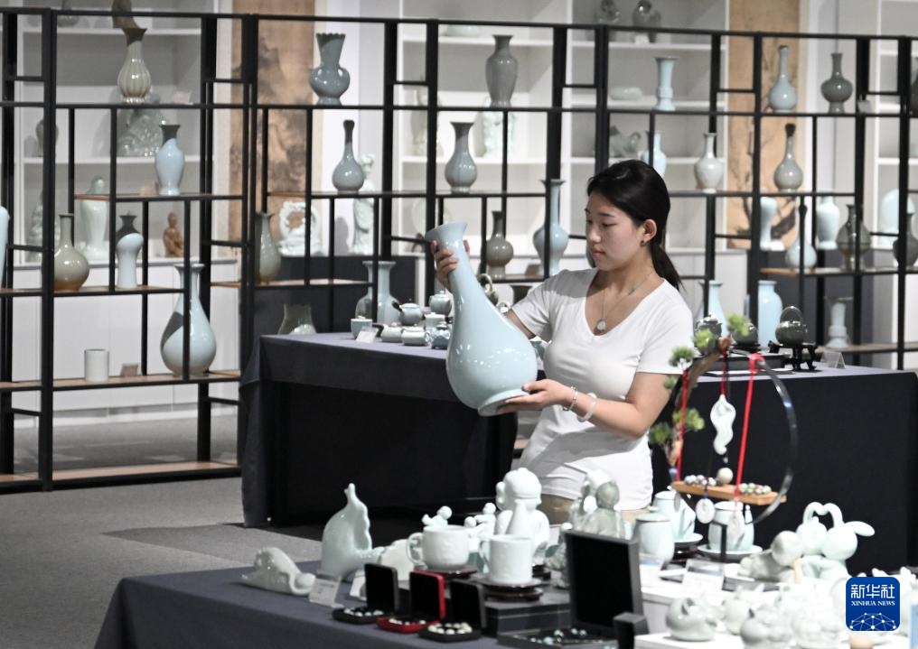 5月29日,宝丰县一家汝瓷企业的工作人员在整理展厅内的汝瓷产品。