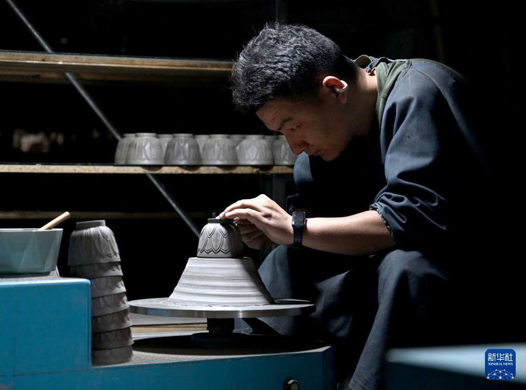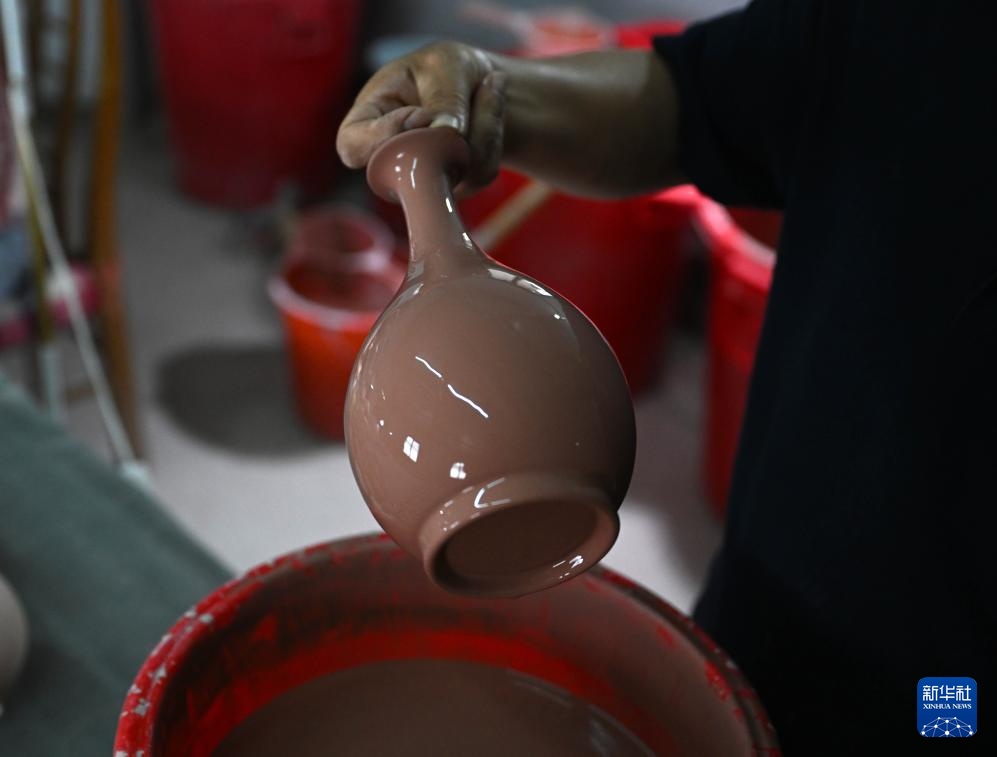 5月29日,宝丰县一家汝瓷企业的工人在修釉。