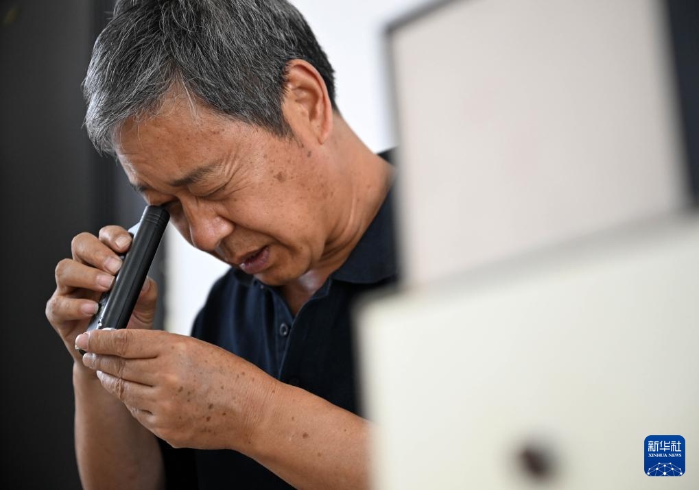 5月28日,汝瓷艺人王国奇在使用放大镜查看汝瓷残片釉面。