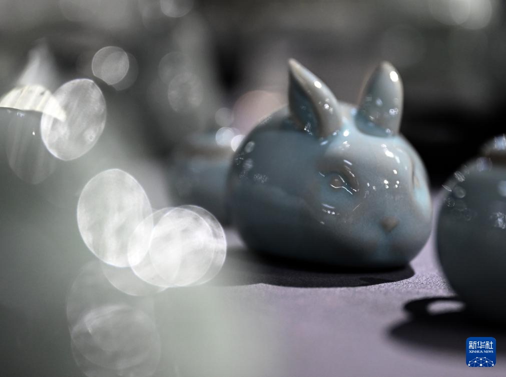 这是宝丰县一家汝瓷企业生产的瓷兔产品(5月29日摄)。