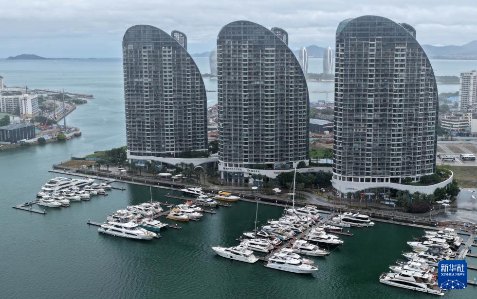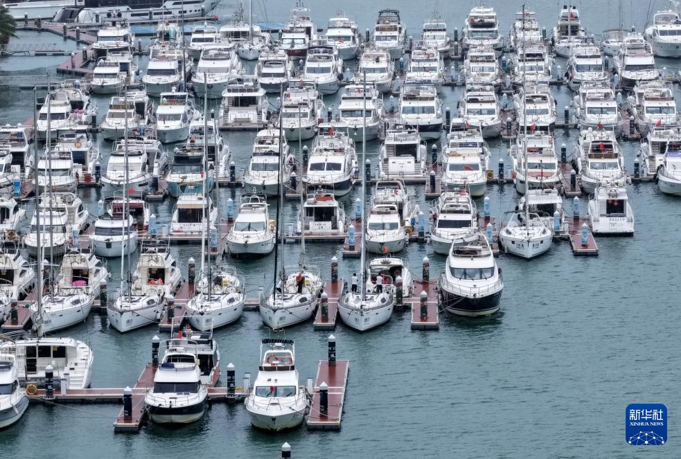 6月12日,受台风“蝴蝶”影响,游艇停泊在三亚市鸿洲游艇码头避风。