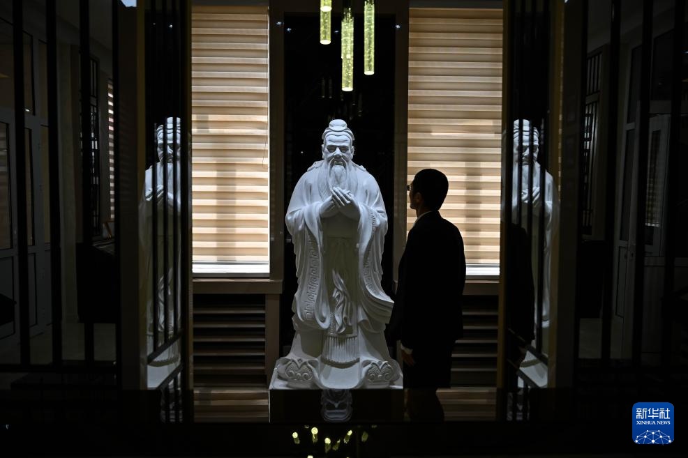6月1日,在位于杜尚别的塔吉克斯坦民族大学孔子学院,夏冉在孔子雕像前驻足。