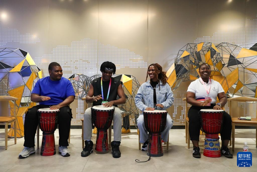 6月12日,在长沙的中非经贸博览会常设展馆,非洲籍志愿者打手鼓欢迎来访的客人。