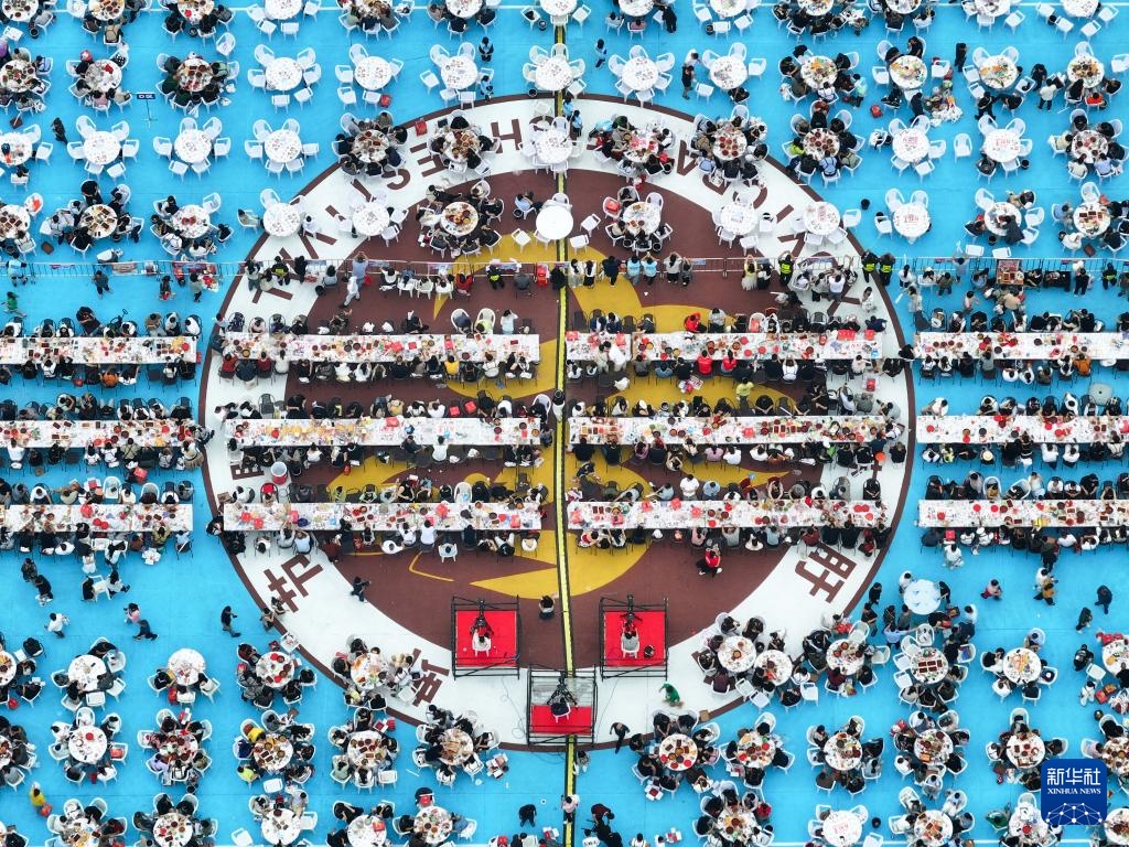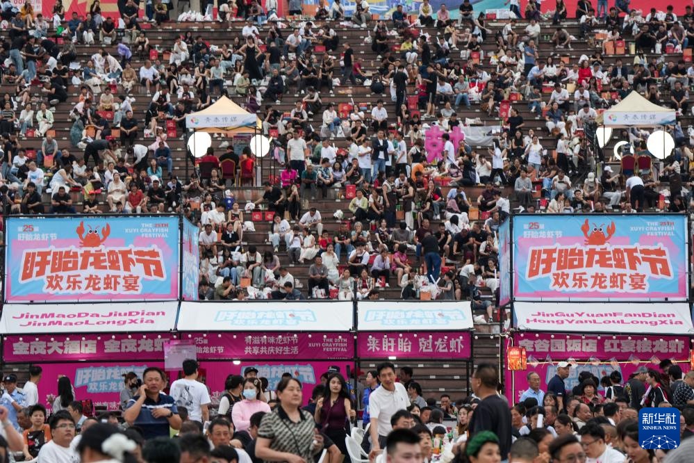 6月12日,人们在龙虾宴上品尝小龙虾(无人机照片)。
