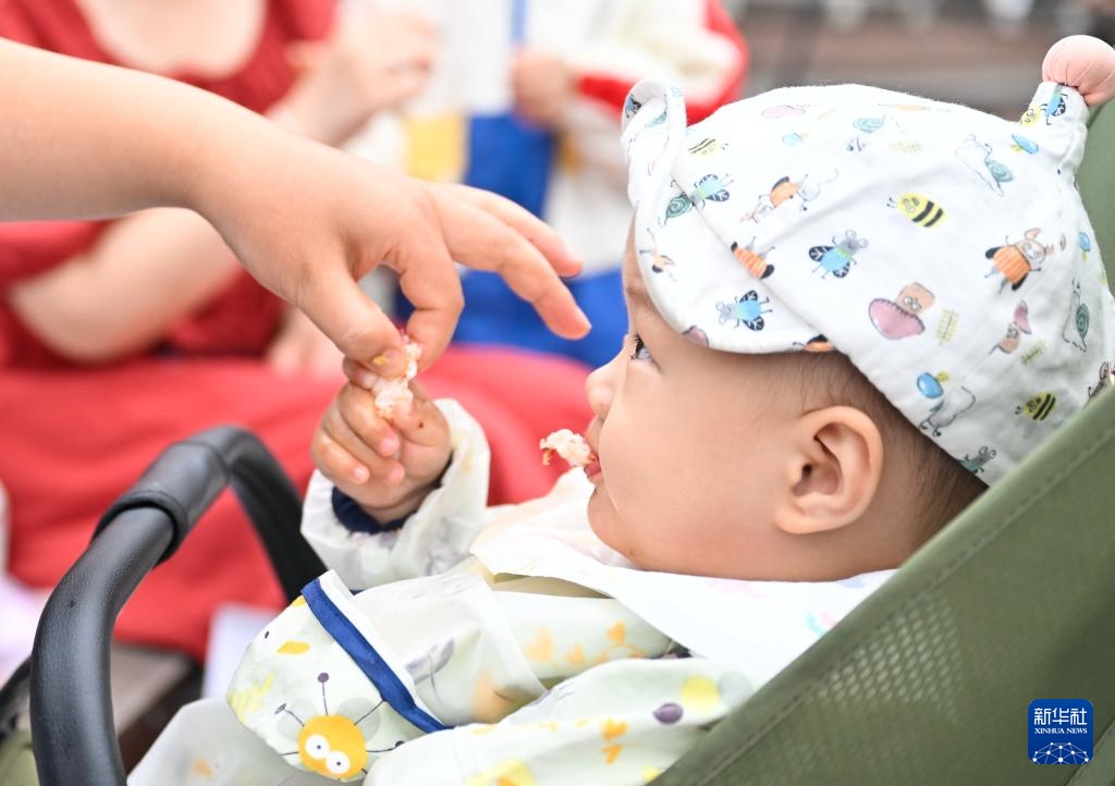 6月12日,一名家长在龙虾宴现场给孩子试吃小龙虾。