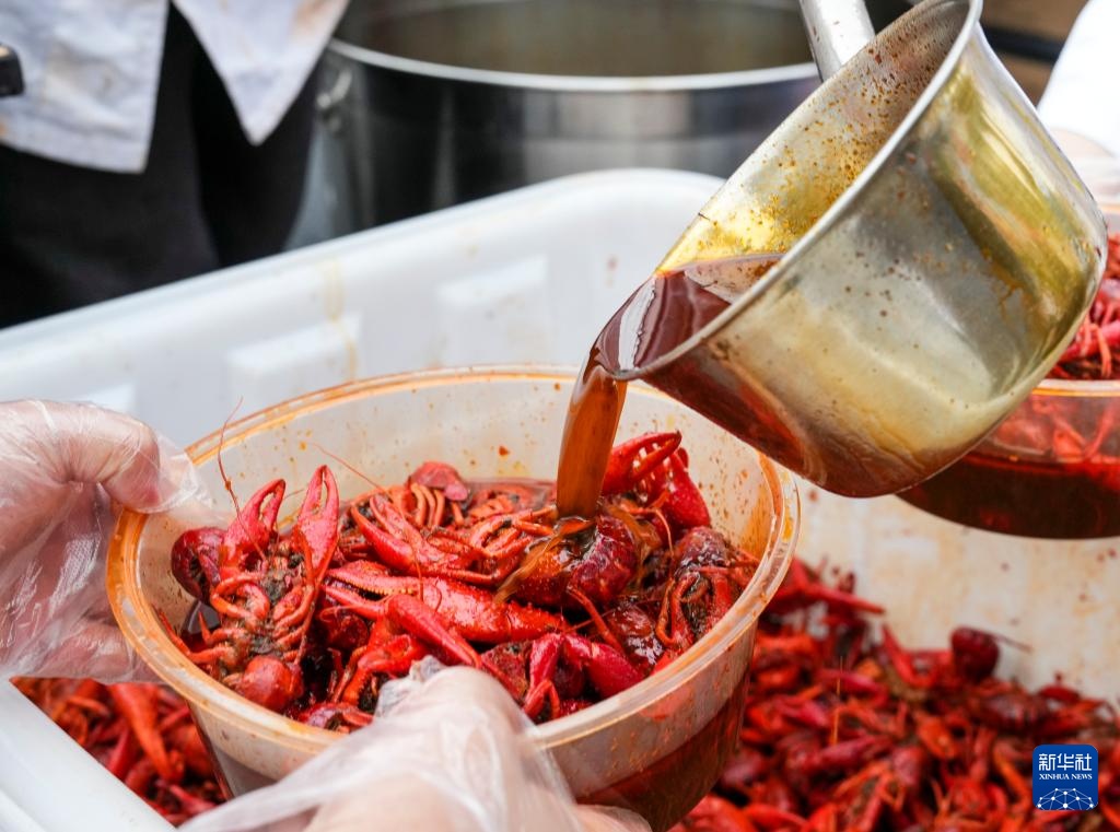 6月12日,工作人员在活动现场展示小龙虾美食。