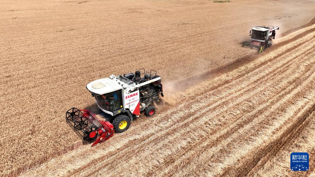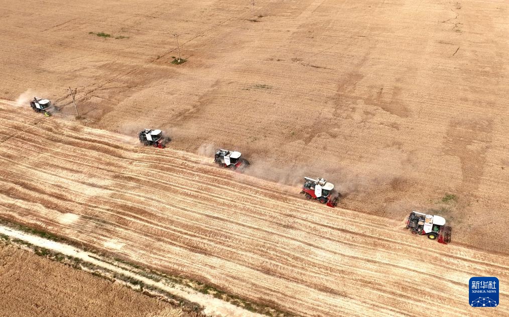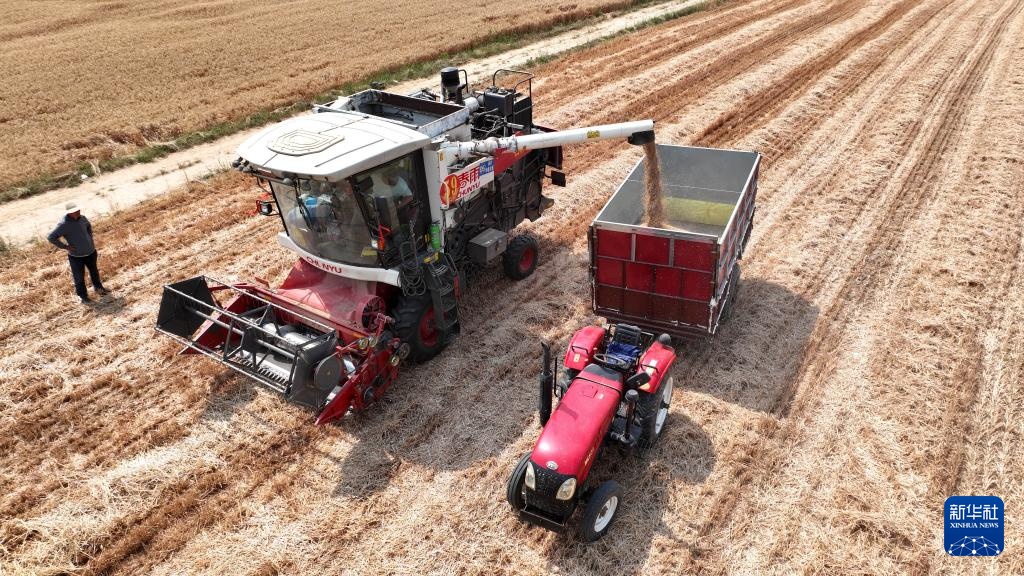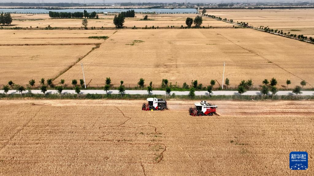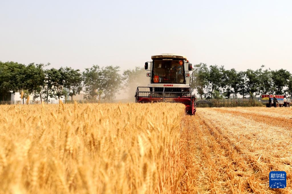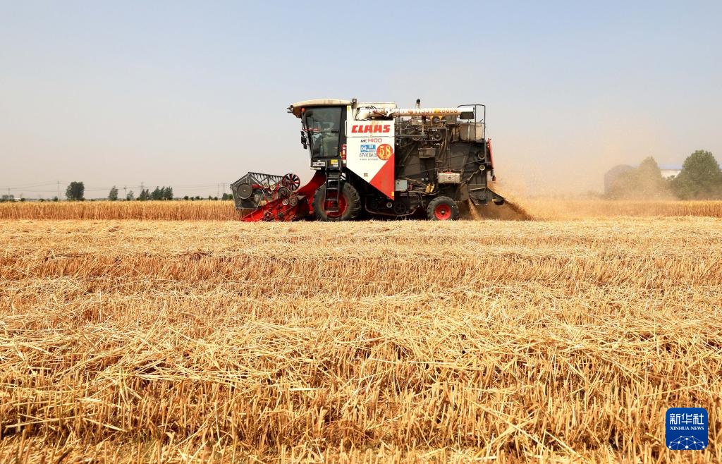 6月12日,收割机在河北省邢台市隆尧县双碑乡西良村麦田里收获小麦。