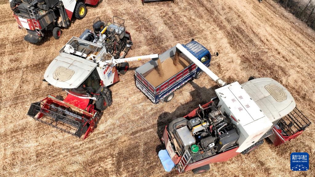 6月12日,收割机在河北省邢台市隆尧县双碑乡西良村麦田里将收获的小麦装车(无人机照片)。