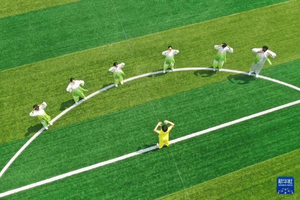 5月29日,艾明君(左一)和同学们一起在长沙医学院操场上练习八段锦(无人机照片)。