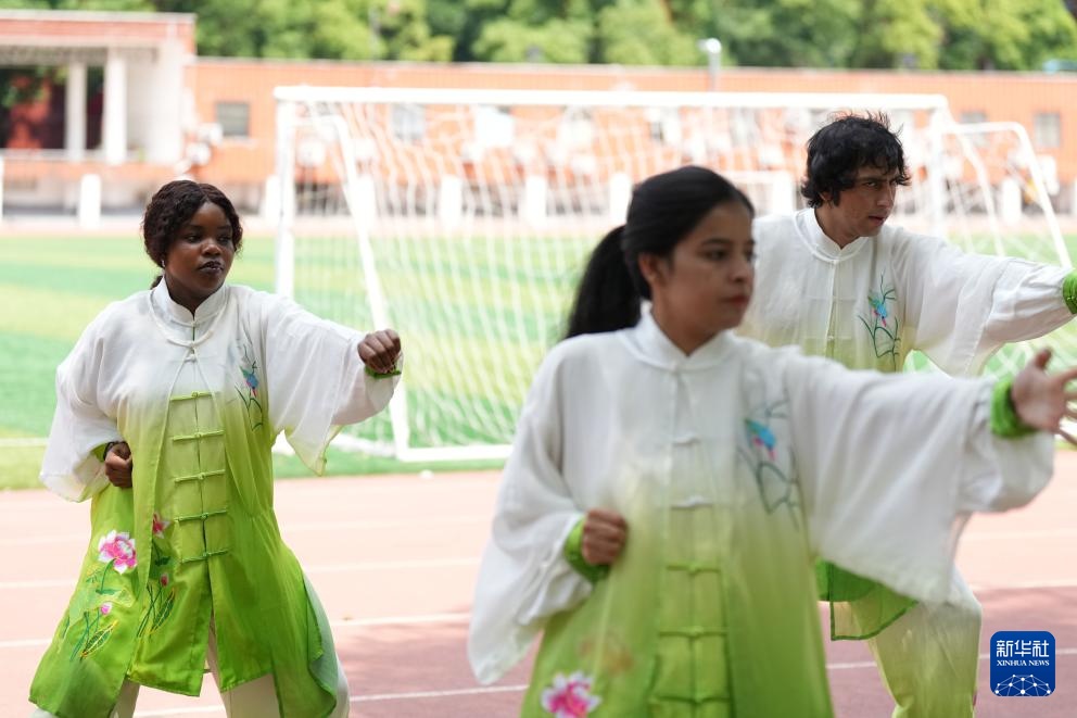 5月29日,艾明君(右三)和同学们在长沙医学院学习八段锦。