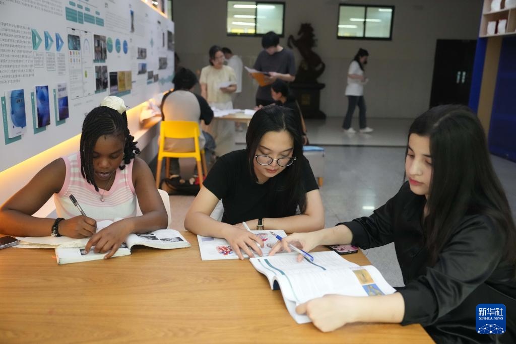 6月10日,艾明君(前左)在长沙医学院和同学们一起自习。