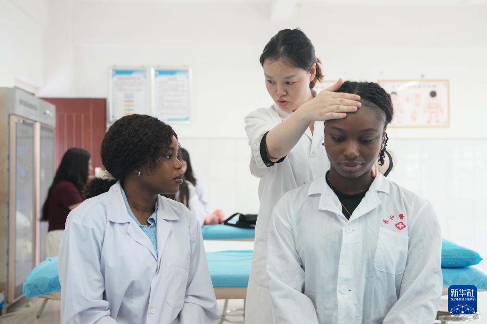 5月29日,艾明君(左)在长沙医学院学习中医推拿。