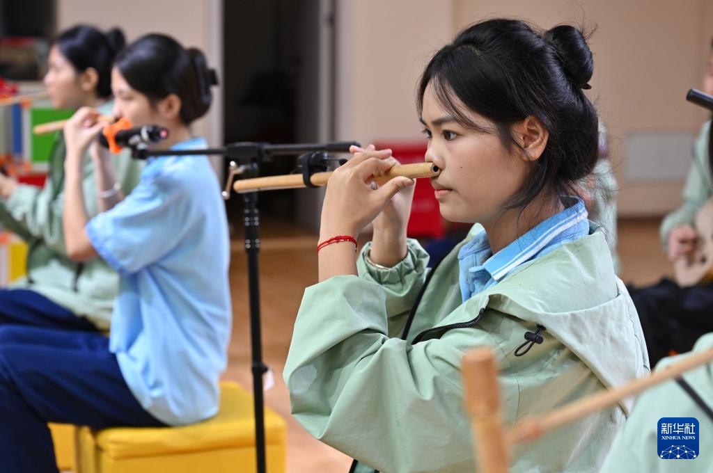6月12日,海南省民族技工学校学生在练习黎族鼻箫。
