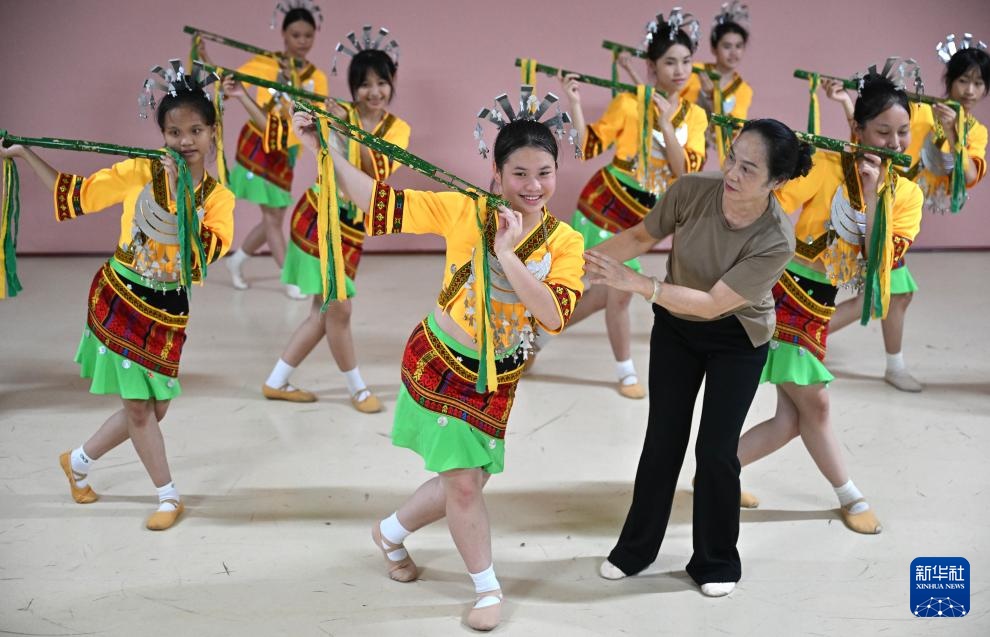 6月10日,海南省民族技工学校老师刘青梅(右三)指导学生练习黎族舞蹈《守山兰的阿妹》。