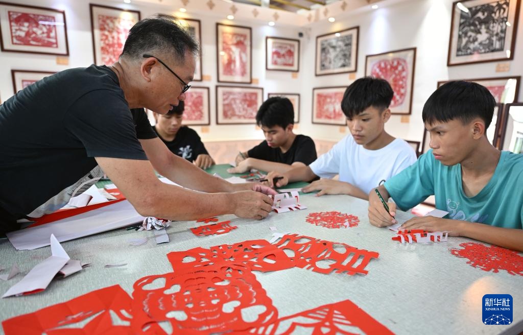 6月10日,海南省民族技工学校老师韦勤在教学生黎族剪纸。