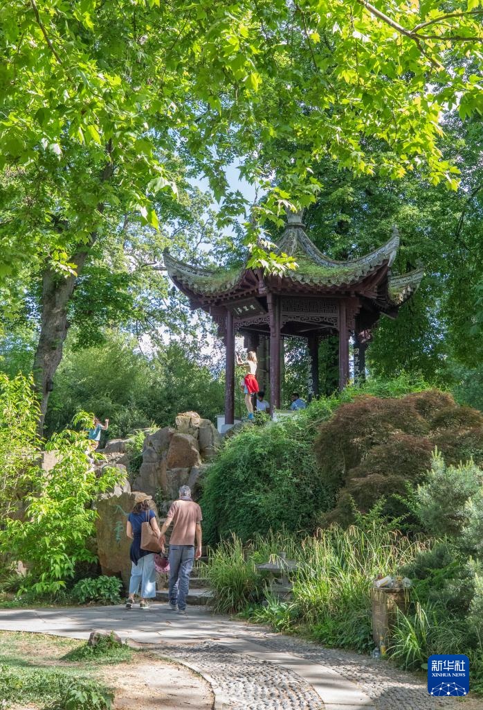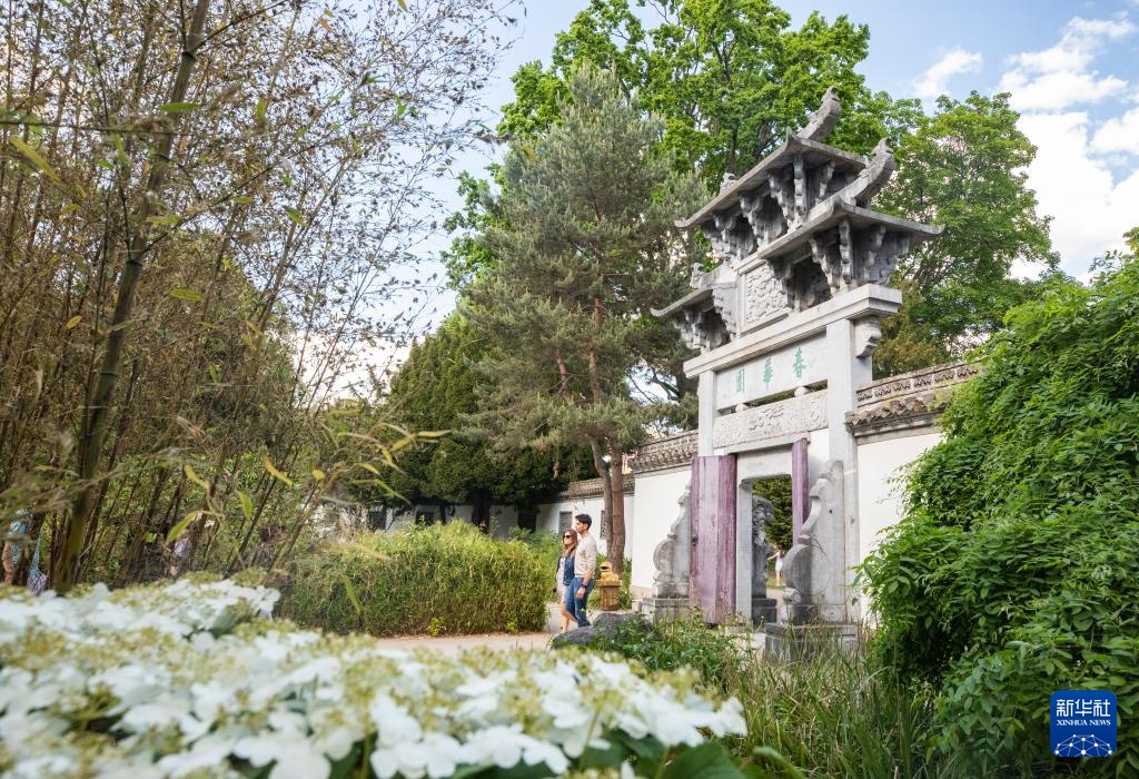5月11日,人们在德国法兰克福的春华园中享受休闲时光。