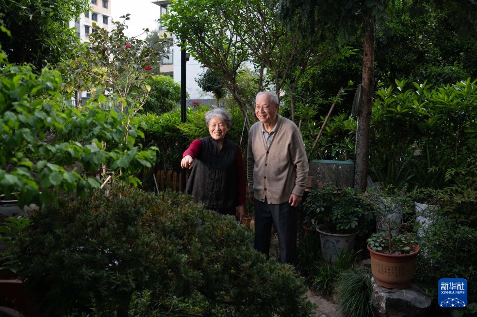 4月10日,在安徽省黄山市屯溪区的家中小院里,徽州古建筑专家程极悦(右)与妻子童建英交流。