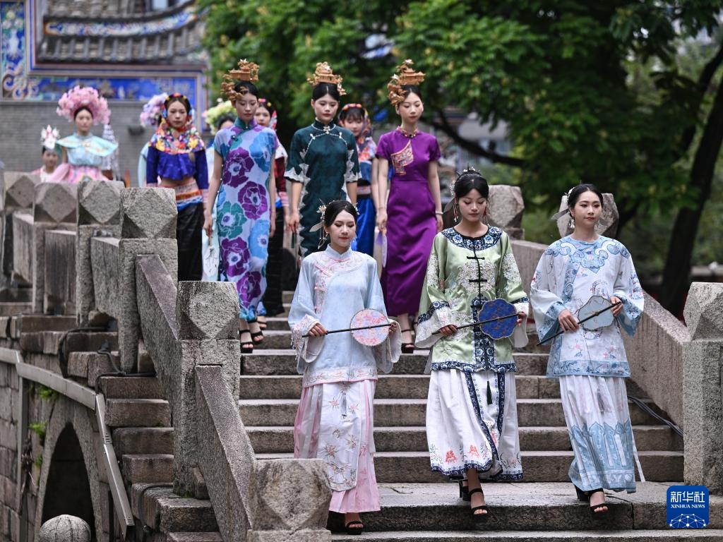 6月14日,模特在福建非遗主会场活动中展示福州“三条簪”、泉州“簪花围”等传统发饰。