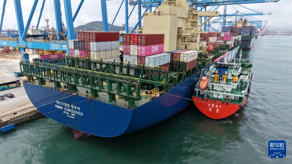6月14日,山东港口青岛港前湾港区109泊位,“大源油8”轮(右)在为“现代温哥华”轮加注燃料油(无人机照片)。