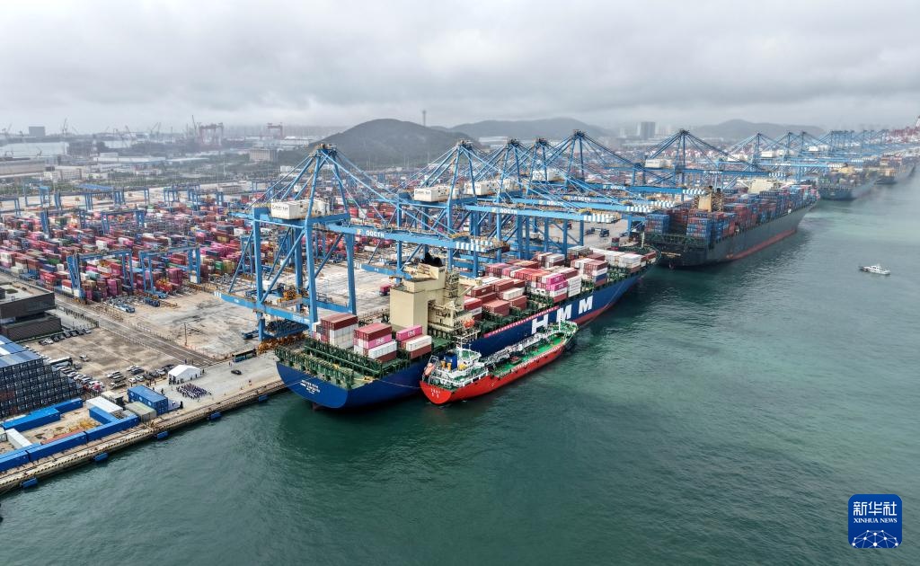 6月14日,山东港口青岛港前湾港区109泊位,“大源油8”轮(中)在为“现代温哥华”轮加注燃料油(无人机照片)。
