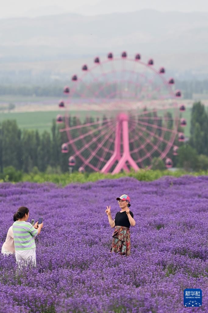游客在新疆伊犁哈萨克自治州霍城县解忧公主薰衣草农场游玩(6月14日摄)。