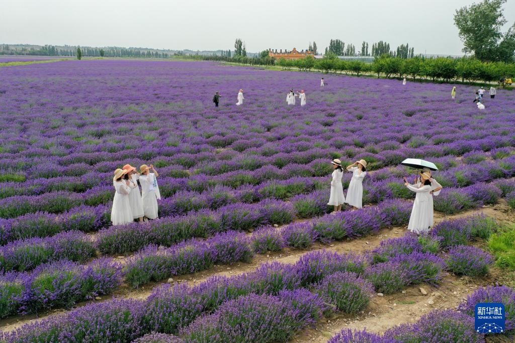 游客在新疆伊犁哈萨克自治州霍城县解忧公主薰衣草农场游玩(6月14日摄,无人机照片)。