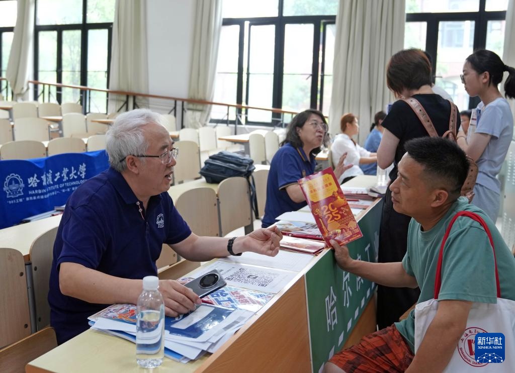 6月15日,哈尔滨工业大学的招生老师(左)与考生家长交流。
