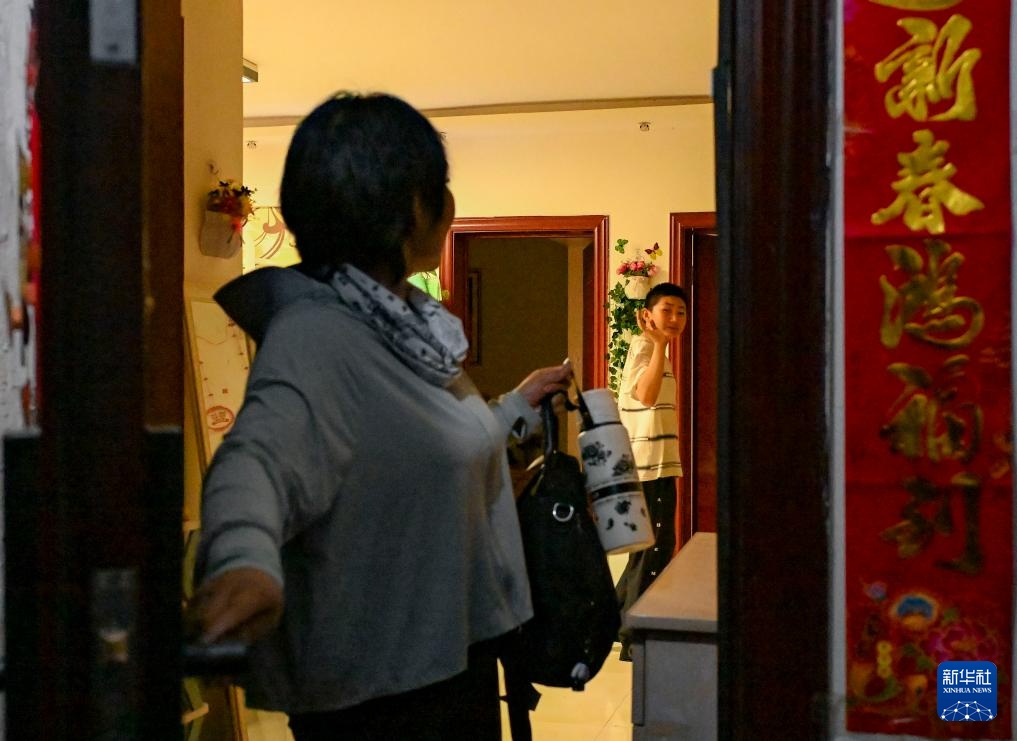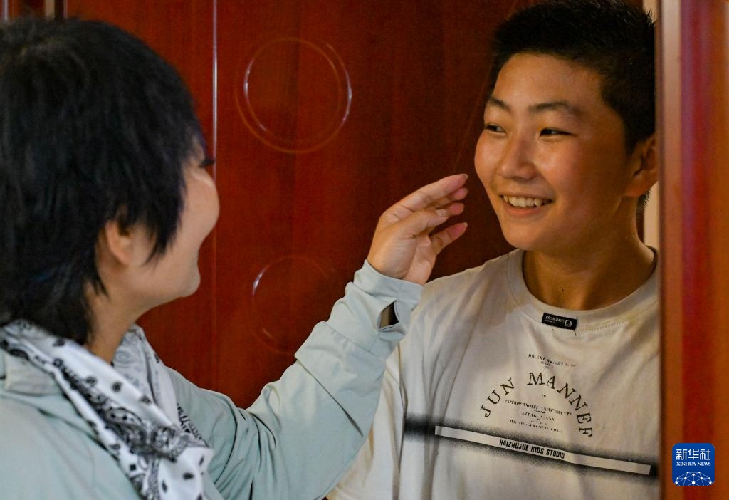 高云(左)在新疆霍尔果斯家中同儿子告别(6月9日摄)。这次运车出国的任务在晚上,她当天无法回家陪伴儿子。