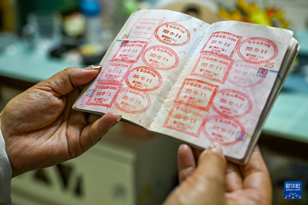 “摆渡人”高云在新疆霍尔果斯的家中展示她的第一本护照(6月9日摄)。这些出入境章记录了她的汽车“摆渡”旅程。