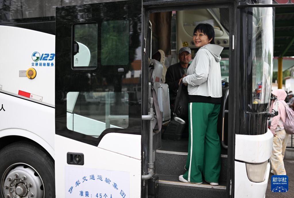 清晨,高云在哈萨克斯坦扎尔肯特镇汽车站登上跨国客运大巴,准备返回中国(5月24日摄)。