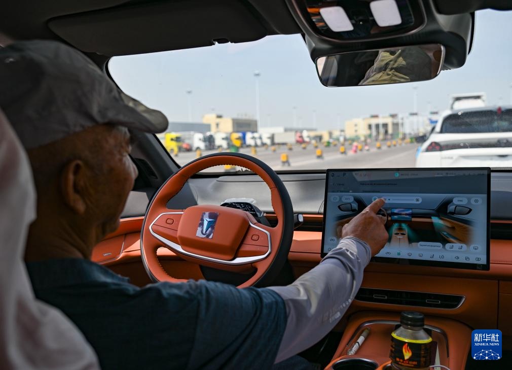 在新疆霍尔果斯市内,高云驾驶即将运送出国的新能源汽车驶向口岸(6月10日摄)。