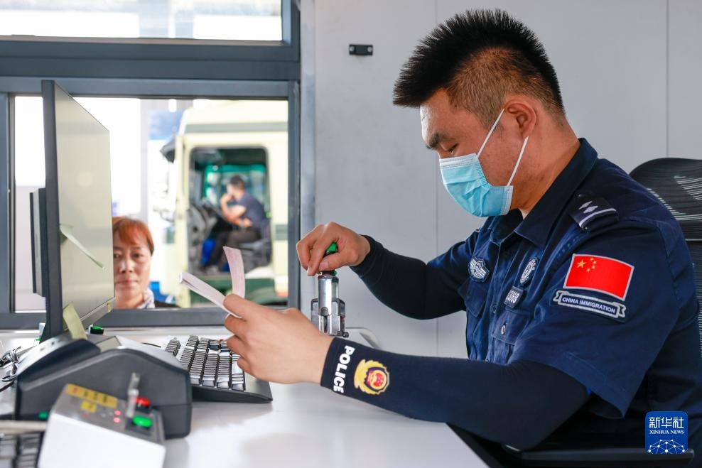 在新疆霍尔果斯公路口岸货运执勤现场,霍尔果斯边防检查站移民管理警察为一名“摆渡人”办理出境边防检查手续(5月28日摄)。