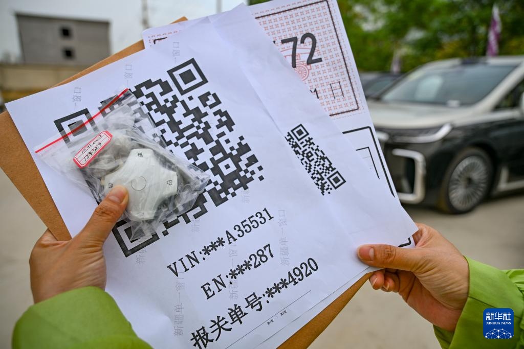 在新疆霍尔果斯一家汽车贸易公司,一名“摆渡人”展示领取到的车钥匙和出关所需资料(6月10日摄)。2024年10月,霍尔果斯公路口岸正式运行“自驾出口商品车快速通关模式”,企业可以在线上生成包含车辆各类信息的二维码,通关时享受“一扫即过”的便捷服务。
