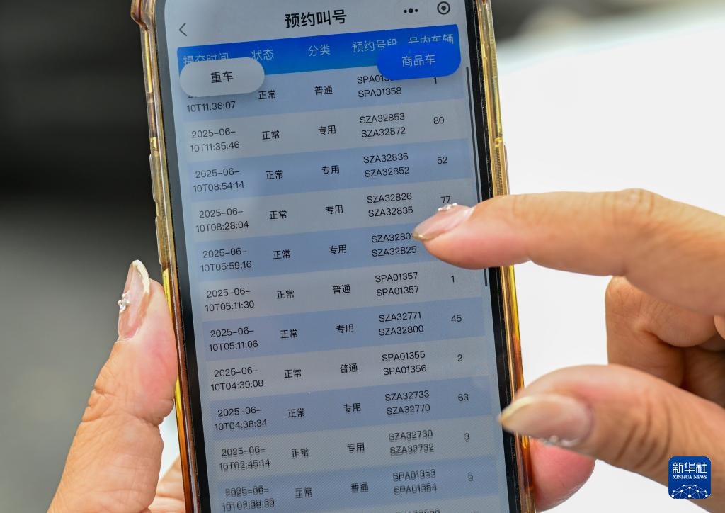 高云通过“霍尔果斯经济开发区口岸管理局”小程序,查看商品车出口预约叫号情况(6月10日摄)。