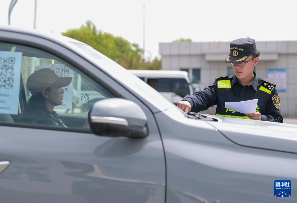 在新疆霍尔果斯公路口岸海关集中查验场,霍尔果斯海关工作人员(右)查验一辆由“摆渡人”驾驶出境的车辆的相关信息(5月28日摄)。2024年10月,霍尔果斯公路口岸正式施行“自驾出口商品车快速通关模式”,企业可以在线上生成包含车辆各类信息的二维码,通关时享受“一扫即过”的便捷服务。