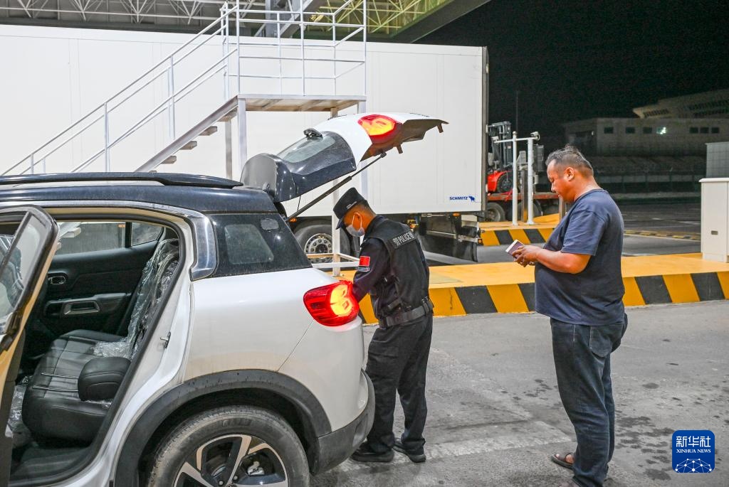凌晨,在新疆霍尔果斯公路口岸货运执勤现场,霍尔果斯边防检查站移民管理警察查验由“摆渡人”运送出国的车辆(6月11日摄)。