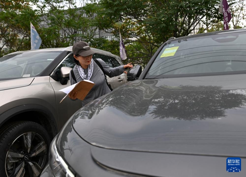 在新疆霍尔果斯一家汽车贸易公司,“摆渡人”高云在取车后检查车况(6月10日摄)。