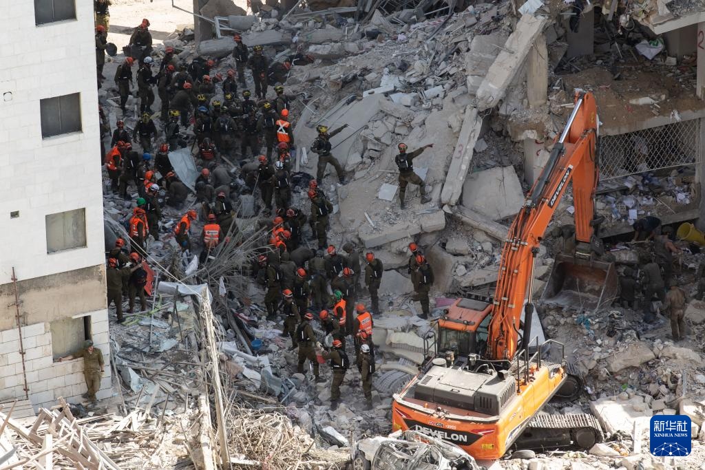 6月15日,在以色列中部巴特亚姆市的一处导弹袭击现场,应急和救援人员搜寻废墟下的人员。