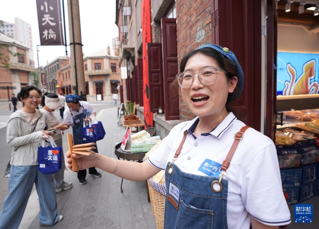 在大连东关街历史文化街区,一名售货员以快板的方式推销美食商品(6月13日摄)。