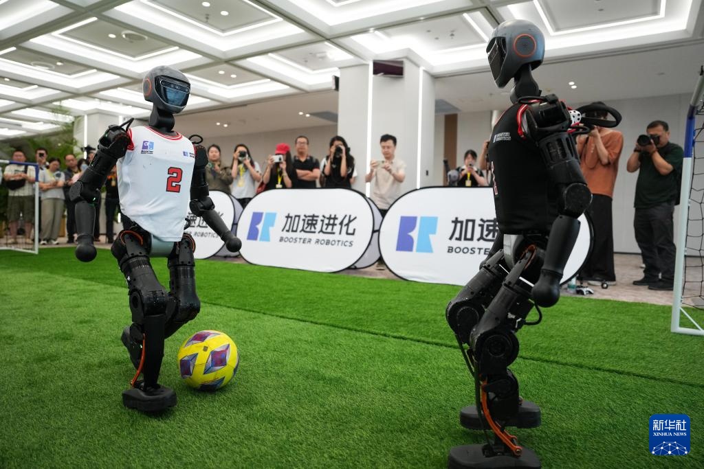 6月17日,加速进化Booster T1机器人在北京经开区的机器人大世界进行1对1足球比赛展示。