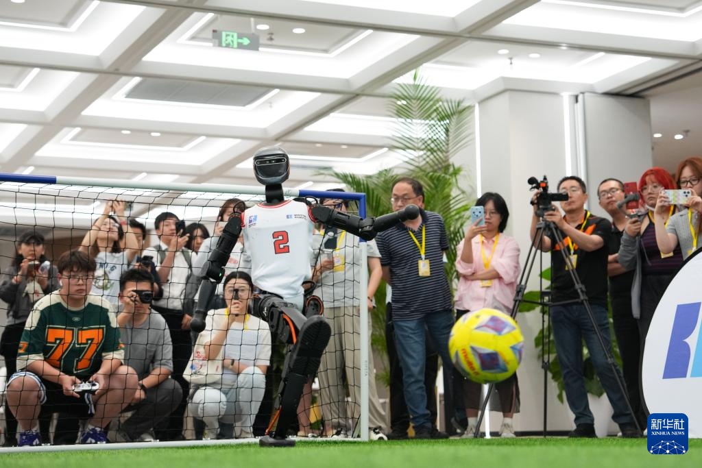 6月17日,加速进化Booster T1机器人在北京经开区的机器人大世界展示“大力射门”。