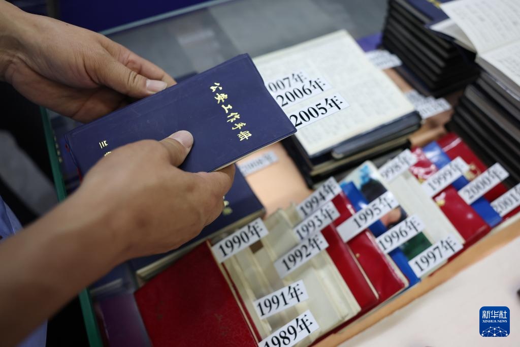 王仁福在长征警务区的铁警警史馆里整理自己的工作笔记本(6月17日摄)。