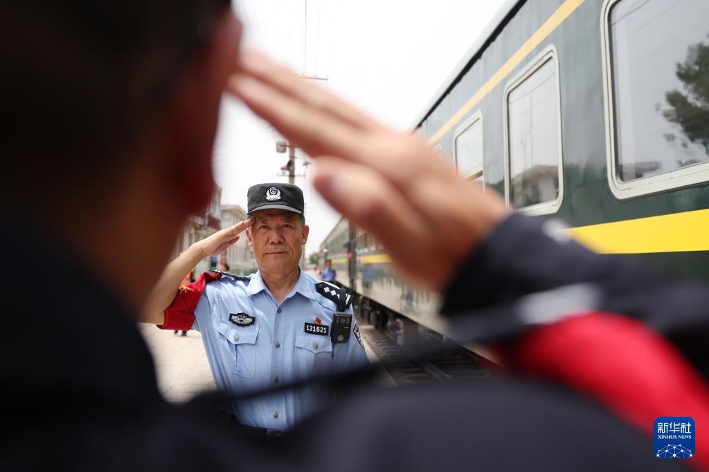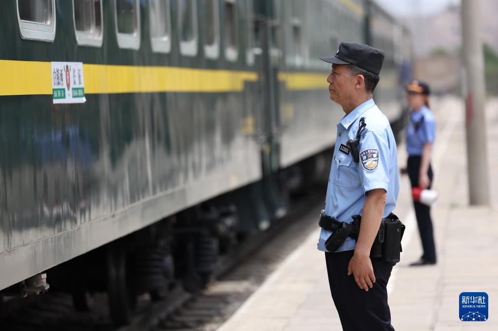 王仁福在长征车站站台上与终到列车的乘警交接工作(6月17日摄)。