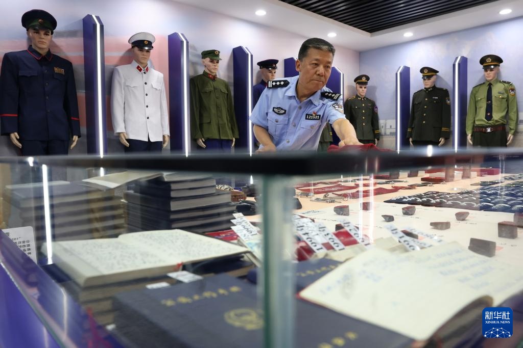王仁福在长征警务区的铁警警史馆里整理自己收藏的老警服(6月17日摄)。