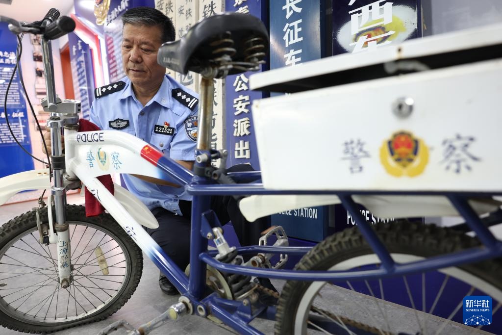 王仁福在长征警务区的铁警警史馆里擦拭自己收藏的警用自行车(6月17日摄)。