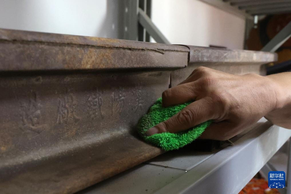 王仁福在长征警务区的铁警警史馆里擦拭自己收藏的老铁轨(6月17日摄)。