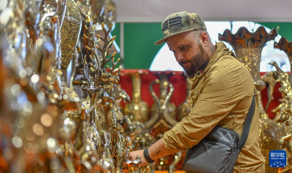 6月18日,来自巴基斯坦的参展商在展区内摆放工艺品。