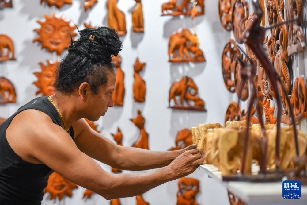 6月18日,来自斯里兰卡的参展商在展区内摆放木雕工艺品。