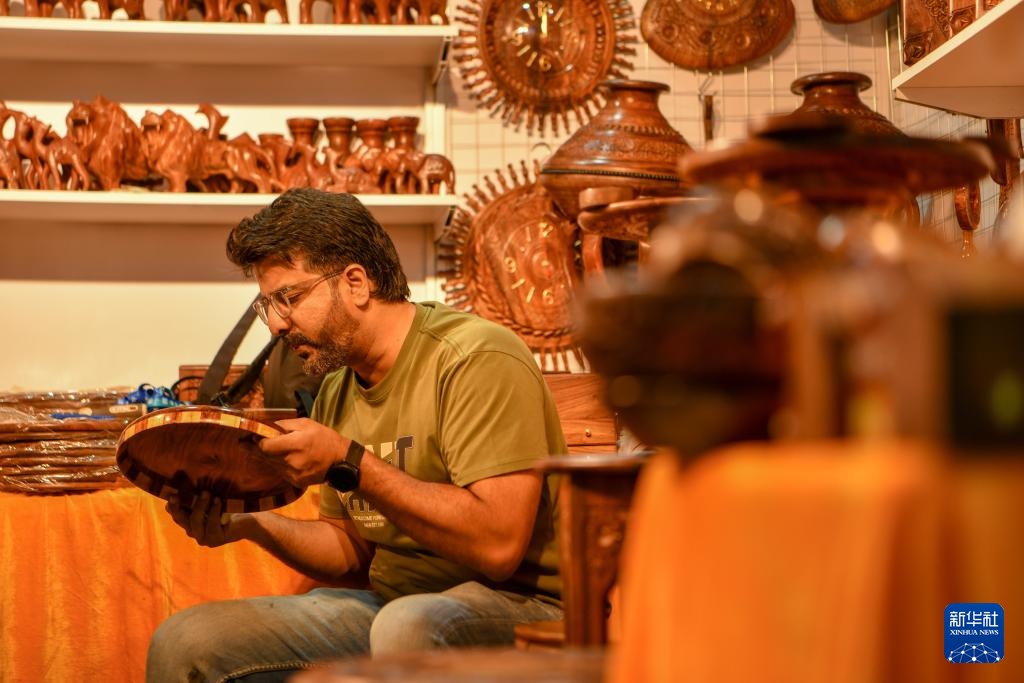 6月18日,来自巴基斯坦的参展商修饰即将展出的木雕工艺品。